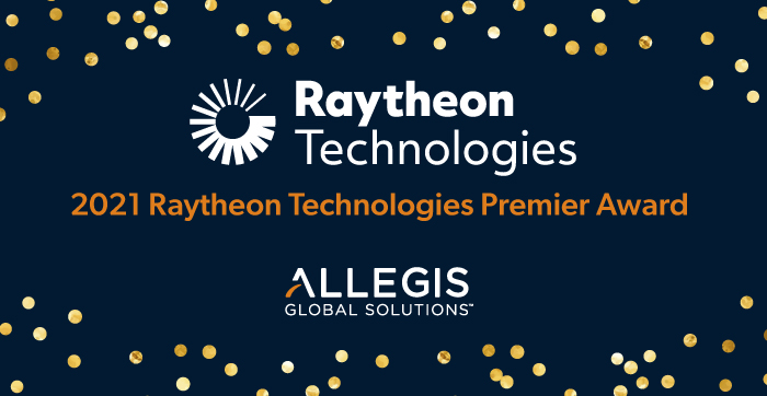 HANOVER, MD. (July 6, 2022) – Allegis Global Solutions (AGS), the leading provider of global workforce solutions, was awarded a Raytheon Technologies Premier Award for performance in 2021 and overall excellence in business management / customer service and collaboration.