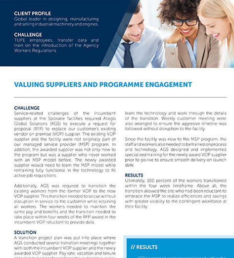 Service-related challenges of the incumbent suppliers at the Spokane facilities required Allegis Global Solutions (AGS) to execute a request for proposal (RFP) to replace our customer’s existing vendor on premise (VOP) supplier. The existing VOP supplier and the facility were not originally part of our managed service provider (MSP) program. In addition, the awarded supplier was not only new to the program but was a supplier who never worked with an MSP model before. The newly awarded supplier would need to learn the MSP model while remaining fully functional in the technology to fill active job requisitions.